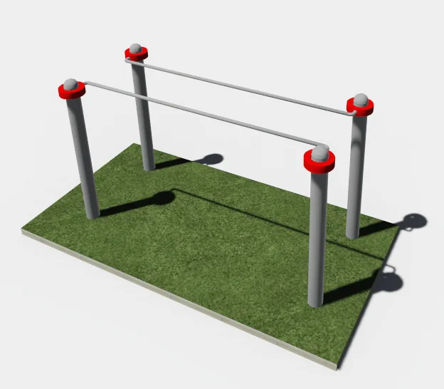 Брусья состоят из 4-х вертикальных столбов и 2-х жердей, брусья располагаются параллельно друг другу. Длина каждой жерди 1898 мм. Расстояние между внутренними поверхностями жердей 550 мм, они находятся на высоте 1100 мм от поверхности основания. Такие параметры позволяют беспрепятственно подъезжать инвалидной коляске.