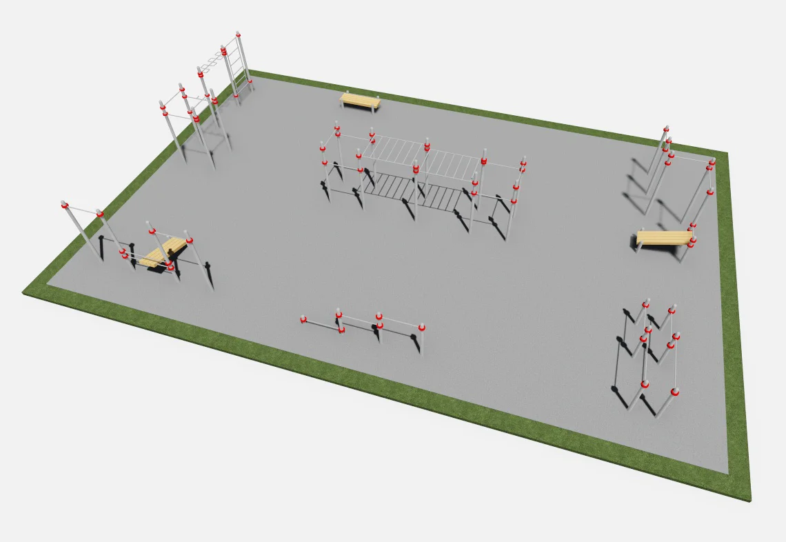 Спортивная площадка включает тренажеры: Ш004, Т005, Б003, СК001, РК002, СК018, СК019.