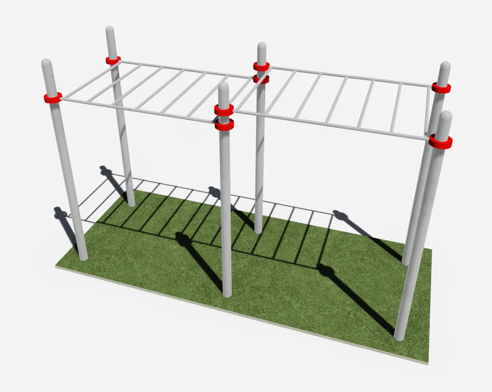 К шести опорным вертикально установленных столбам высотой каждого 2600 мм крепятся при помощи хомутов две секции рукохода.