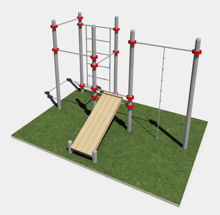 Составляющими данного комплекса являются шведская стенка, турники, скамья для пресса. Шведская стенка крепятся на высоте 2350 мм к опорным столбам высотой 2600 мм.