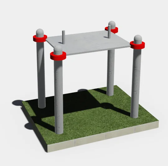 Опорные столбы высотой 1000мм в количестве 4 единиц, диаметр которых предоставляется на выбор, антивандальной столешницы армрестлинг, расположенной на высоте 900 мм от поверхности основания. Столешница крепится к опорным столбам при помощи хомутов. Длина комплекса не более 1400 мм.